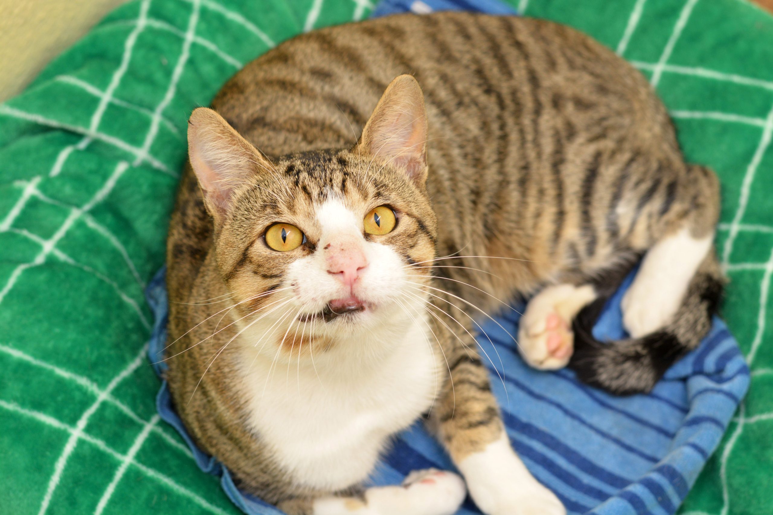 Thankfully, they reached out to Shadow Cats, and even more thankfully, we had the room! So, Barney came to Shadow Cats and immediately ingratiated himself with us. Somehow, it was like he had always been here. He learned mealtime quickly, was thrilled for staff and volunteers to visit him even in his ISO periods. He was immediately a hit at the sanctuary because one of his teeth often snagged on a lip, giving him a snaggletooth grin. He was just heart-meltingly cute!