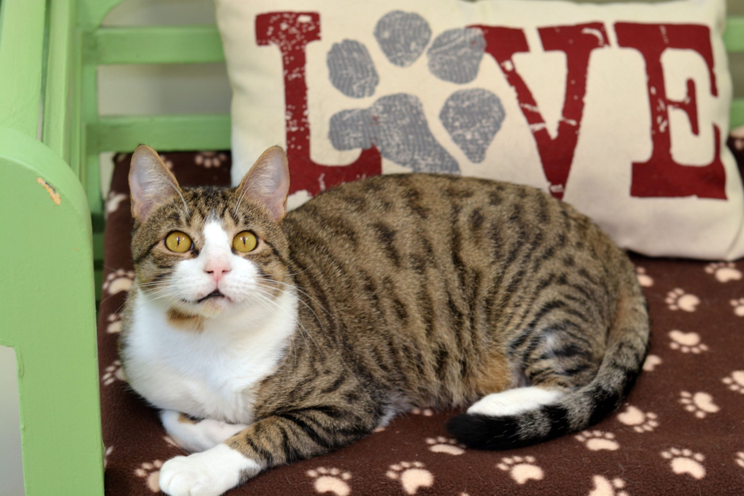 Alas, Barney was a hardened street cat, and the pampered princess’s protests hardly held weight. He knew as much! He settled in like he was far older and wiser than two years of life could’ve possibly given him. It was a precious sight to walk into Cottage and see him sprawled out on his favorite green bench. Later, he happily coiled himself just below Mystique on the tallest cat tree of the room.
