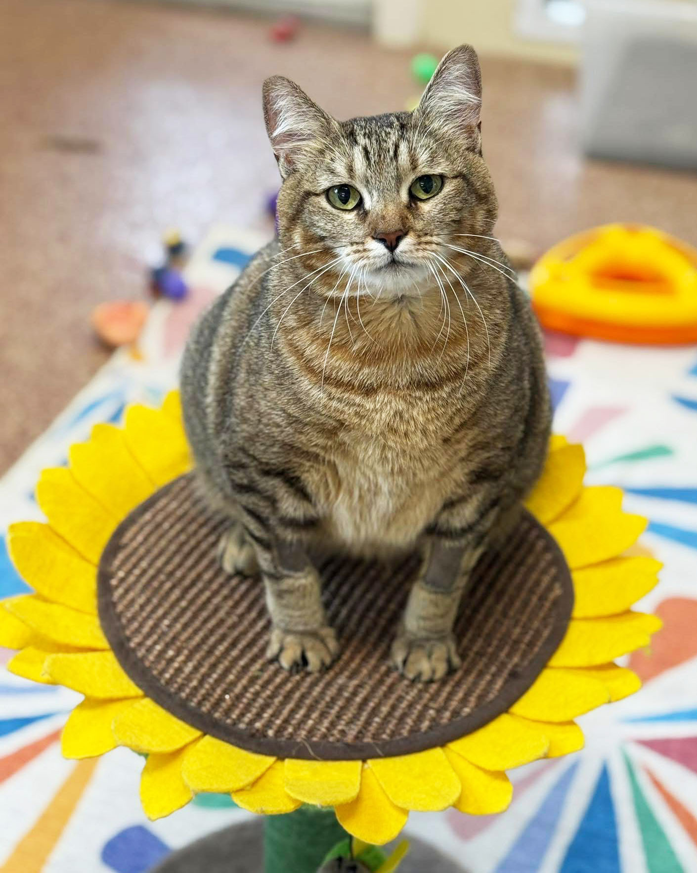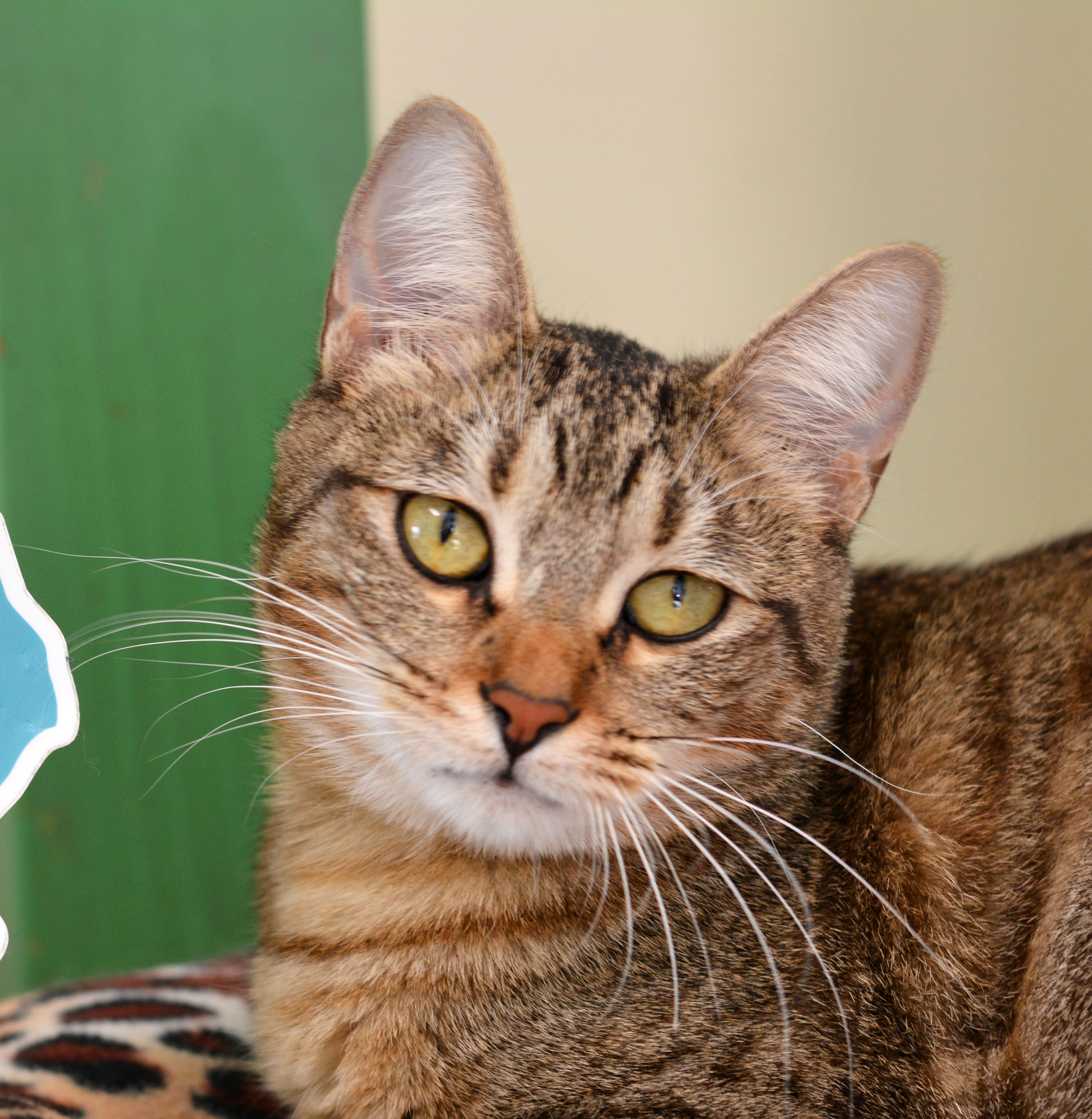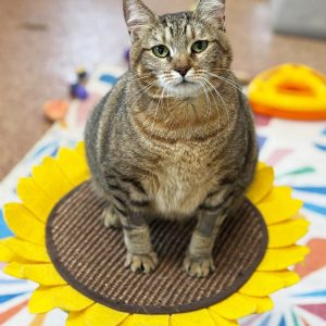 Ebi is the petite brown tabby. She is smaller than her sister but definitely crazier! Her favorite pastime is jumping up and clinging to the sides of her condo or your pants. Ebi is Japanese for shrimp and that is exactly what she looks like when she curls up to sleep. She is just the cutest!