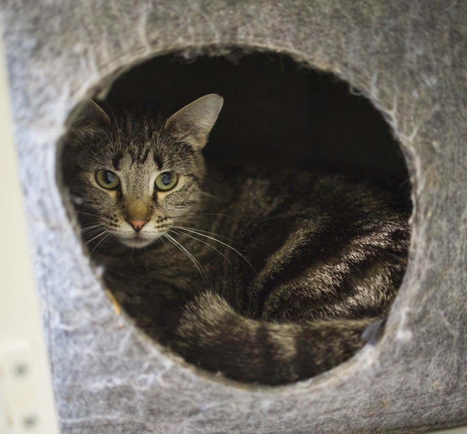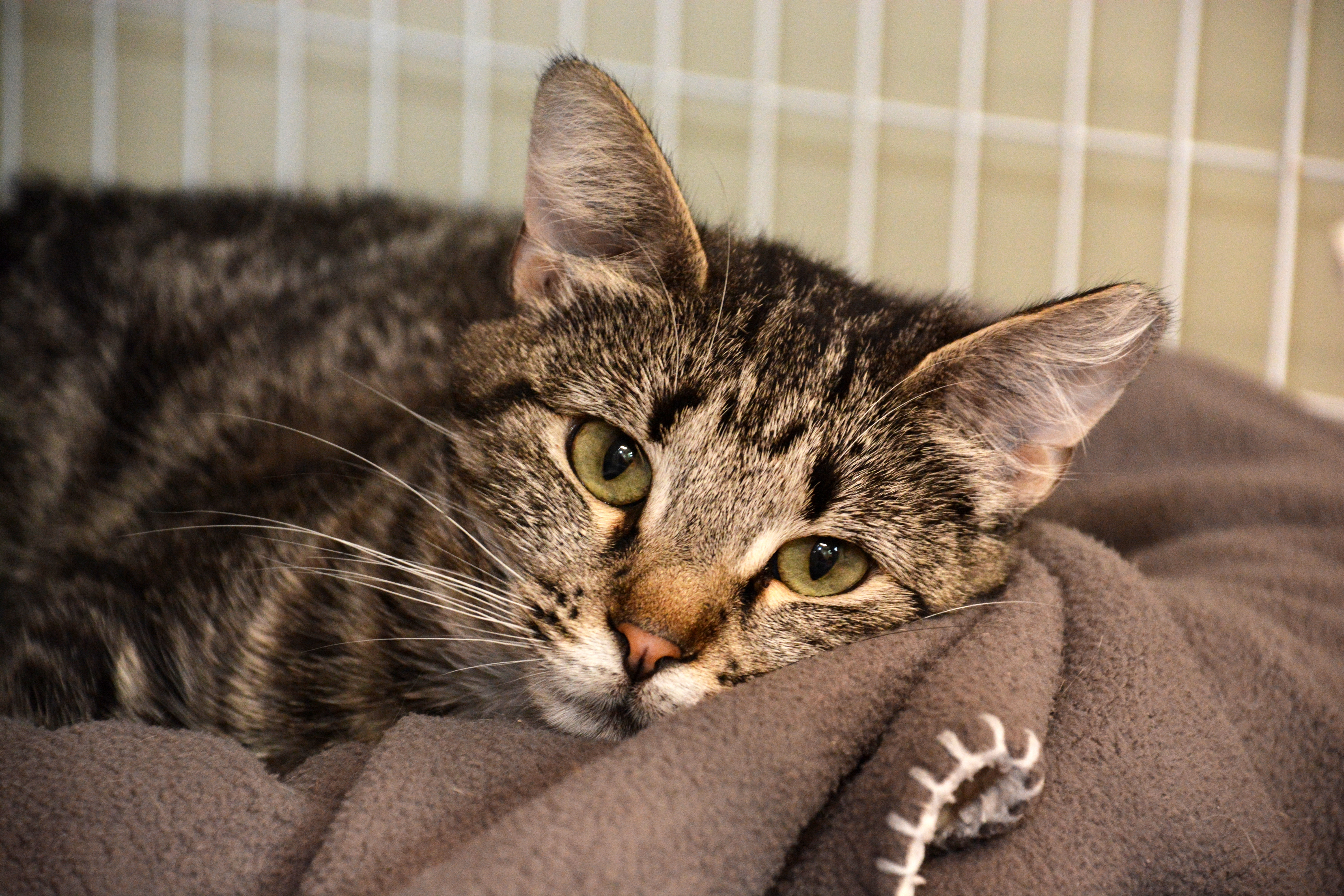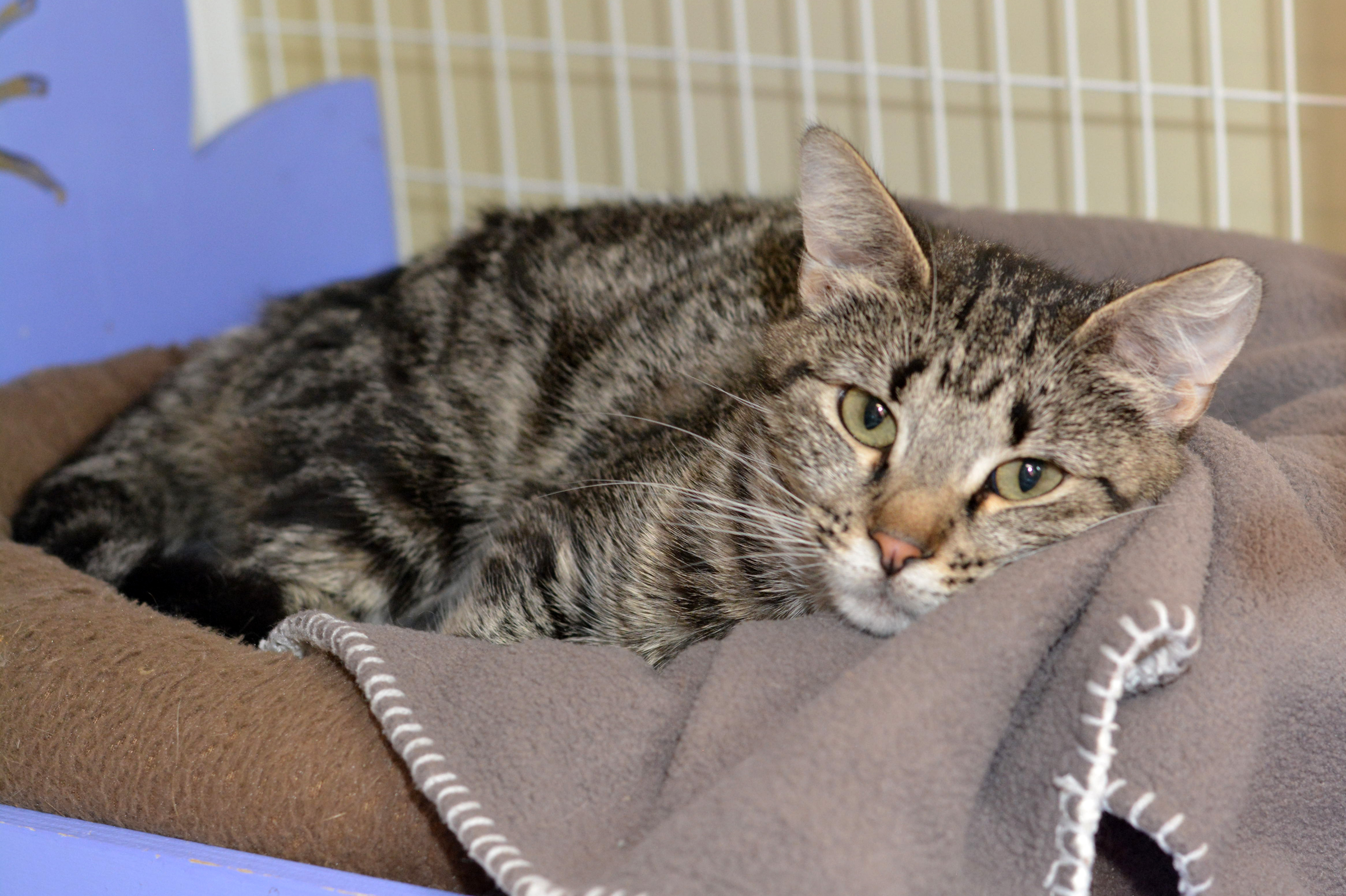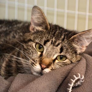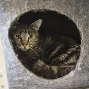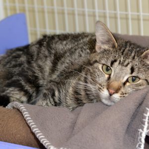 Before she was Mystique, this feisty tabby was affectionately dubbed “Hissy.” She hung out by a dumpster beside a vacant lot, and whenever her caretakers arrived to feed her, this clever girl would come running. She’d chirp her greetings, leading them to her feeder, but get too close and you’d get a warning hiss.