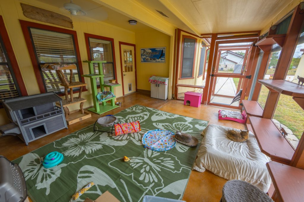 Leaving Oasis brings you to a fully enclosed outdoor catio, thoughtfully designed for safety and enrichment. Shelves invite sunbathing, cat trees offer perfect napping spots, and weatherproof blinds allow our cats to enjoy the outdoors they love, even on rainy days. This catio also serves a special purpose, guiding you through a swinging door to the ramp leading into Cookie’s Place.
