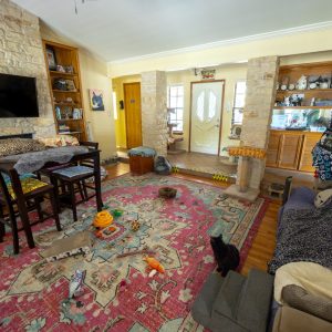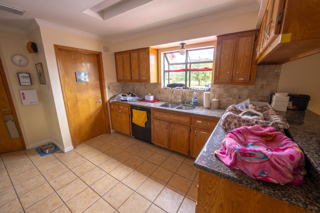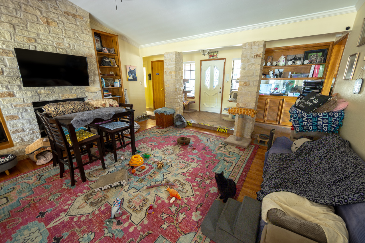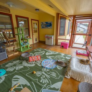 The Oasis area is located in the main building, so the kitties have lots of room to run, play, and sleep. Tucked on the side of Oasis’ sprawling living room is a kitchen with a baker’s window, an irresistible favorite for cats who love to lounge in the sun. Nearby is our exam room, where trained staff perform many routine and specialized medical treatments, including fluid therapy, lab collection, and in-house testing. Each cat receives a thorough weekly assessment, from mobility and heart rate to lung sounds, coat condition, and gum color. This is where our commitment to individualized, specialized care truly shines.
