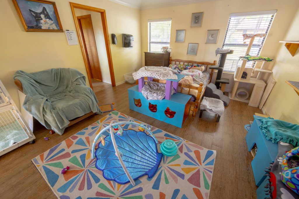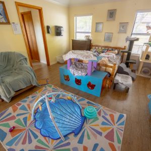The Wild Side area is a climate-controlled room with big windows, plus chairs, shelves, and hidey holes for all. Artwork of the kitty residents supplied by Painting with a Twist artists cover the walls for the cats’ (and visitors’!) pleasure. Connected to this space is an open air screened patio with lounging spots and high shelves where the cats can get up high and watch over their domain.